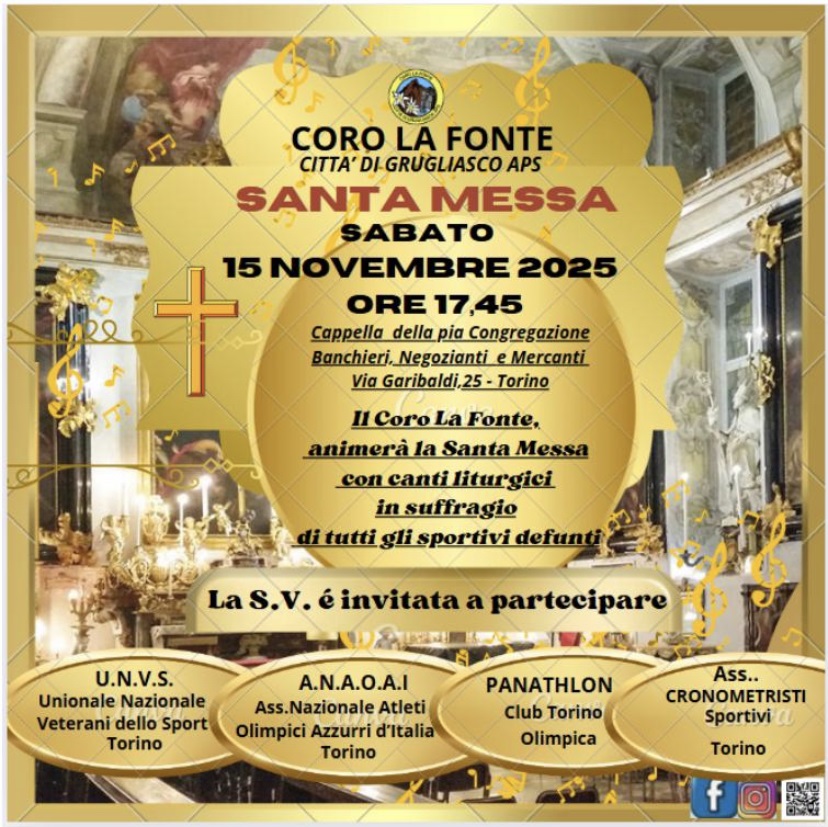 17:45 | Animazione Liturgica della Santa Messa in suffragio di tutti gli Sportivi Defunti organizzata da U.N.V.U.S (Unione Nazionale Veterani dello Sport), A.N.A.O.A.I.(Ass.ne Nazionale Atleti Olimpici Azzurri d'Italia), PANATHLON (Club Torino Olimpica) e Ass.ne CRONOMETRISTI Sportivi Torino. |